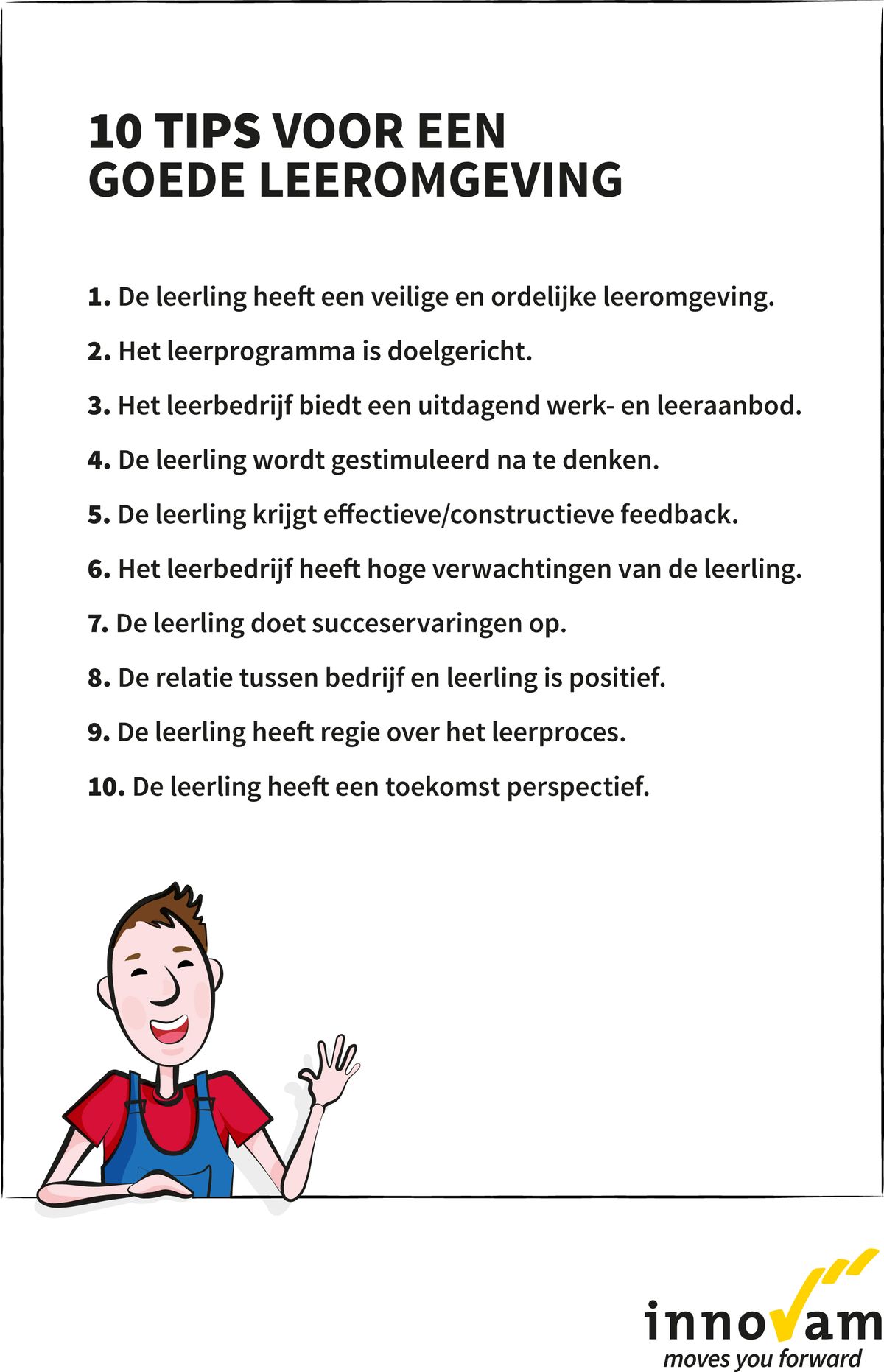 Een belangrijk deel van de opleiding krijgen BBL’ers en BOL’ers in de werkplaats van uw bedrijf. Door een goede leeromgeving voor leerlingen te creëren, geeft u ze een solide basis voor hun toekomstige baan. En het zorgt dat u leerlingen behoudt in de branche, zodat ze niet uitstromen naar een andere opleiding. Innovam heeft een poster ontwikkeld met 10 tips, die u kunt uitprinten en ophangen in bijvoorbeeld de werkplaats of in de kantine.