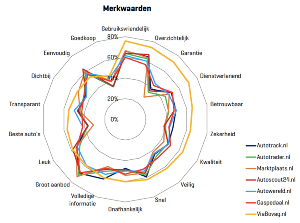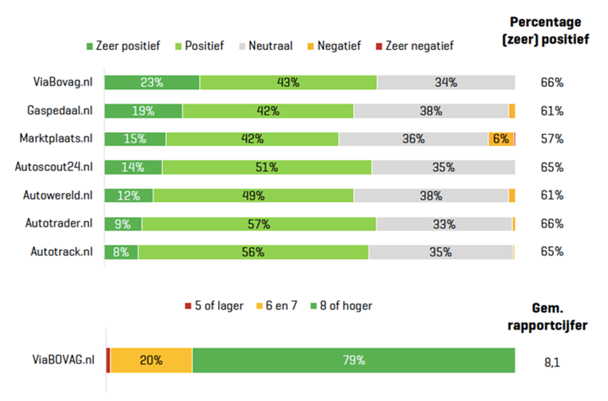 Consumenten geven de website een 8,1 als rapportcijfer. Eenmaal bekend met de website overwegen méér consumenten viaBOVAG.nl dan de andere occasionwebsites. Ze herkennen en waarderen het onderscheidend vermogen van onze website zeer. Dat komt vooral door eigenschappen als betrouwbaar, garantie, zekerheid en kwaliteit. En dat is niet verrassend omdat veel consumenten nog steeds grote onzekerheid kennen als het gaat om het kopen van een occasion,. Het vertrouwen ontbreekt terwijl het wel gaat om een grote financiële beslissing. ViaBOVAG.nl heeft als enige occasionwebsite een geloofwaardig antwoord op die onzekerheid, waardoor viaBOVAG.nl vaak als favoriete website uit de bus komt.