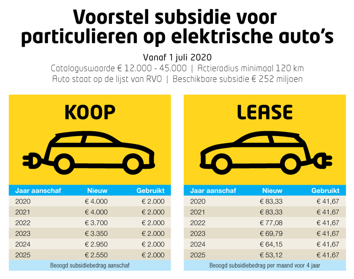 Minister Van Veldhoven van Milieu en Wonen wil met haar voorstel de drempel voor particulieren verlagen om over te stappen op een elektrische auto. De subsidieregeling geldt voor nieuwe of gebruikte emissieloze personenauto’s met een oorspronkelijke cataloguswaarde tussen de 12.000 en 45.000 euro met een minimale actieradius van 120 kilometer. Een andere eis is dat de auto niet direct mag worden doorverkocht. Bij verkoop binnen drie jaar, moet een deel van de subsidie worden terugbetaald. Wanneer een berijder een elektrische auto leaset met subsidie en het contact binnen vier jaar beëindigt, dan stopt ook de subsidie, die in maandelijkse termijnen wordt uitbetaald. Om voor de subsidie in aanmerking te komen, moet de auto bij een autobedrijf met RDW-erkenning Bedrijfsvoorraad worden aangeschaft. Leasebedrijven moeten het Keurmerk Private Lease hanteren. Voor nieuwe auto’s loopt het subsidiebedrag in de komende jaren terug, voor gebruikte auto’s blijft het 2.000 euro.