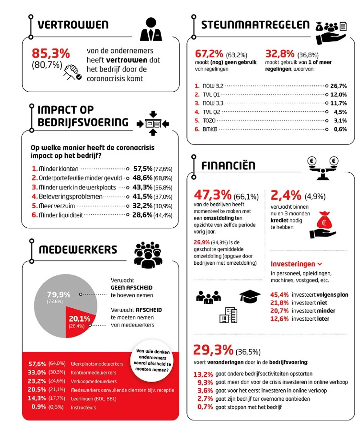 20 procent van de ondervraagden denkt afscheid te moeten nemen van medewerkers. Dat was in de vorige monitor nog 26 procent. Werkplaatsmedewerkers en leerlingen worden wat minder vaak genoemd, kantoorpersoneel wat vaker. Meer ondernemers melden dat ze investeren zoals ze van plan waren. Het percentage ondernemers dat meldt de bedrijfsvoering naar aanleiding van de crisis aan te passen, daalde van 37 naar 29 procent.