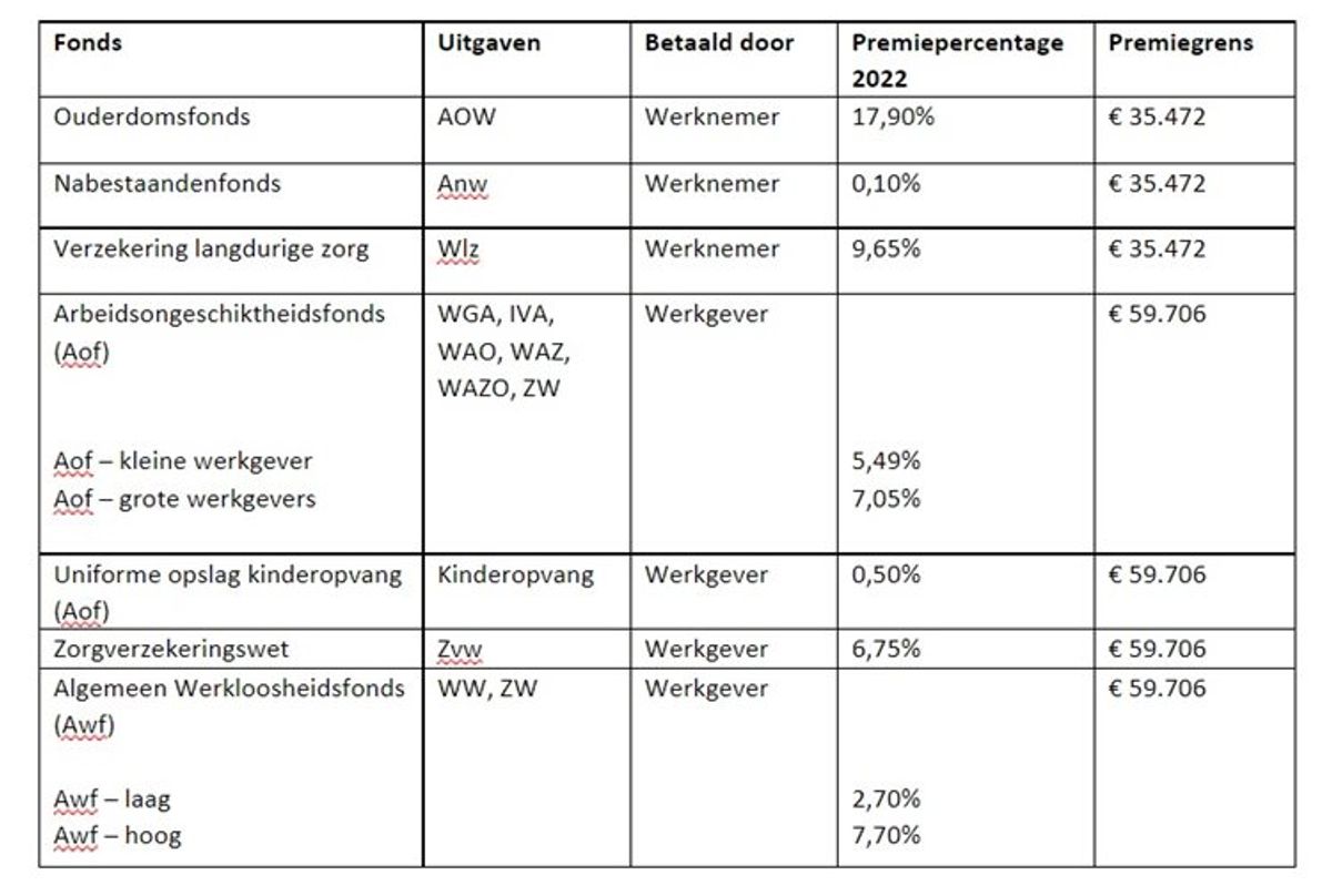 Het Ministerie van Sociale Zaken en Werkgelegenheid (SZW) heeft de volgende premies (in procenten, jonger dan AOW-leeftijd) voor 2022 definitief vastgesteld voor de werknemersverzekeringen en de volksverzekeringen: