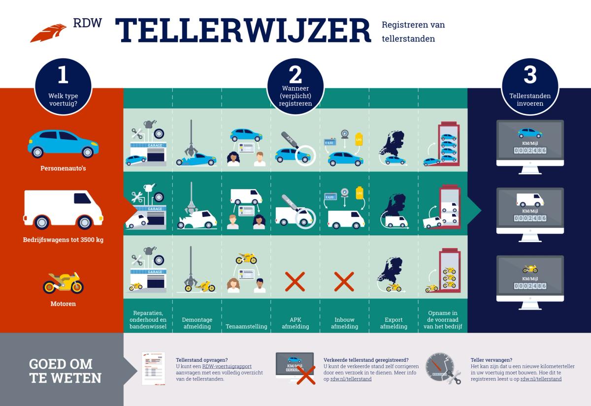 RDW-erkenningshouders moeten vanaf 1 juli vaker de tellerstanden van personenauto’s en bestelwagens registreren. Daarnaast geldt er vanaf die datum registratieplicht voor kilometerstanden van motorfietsen. Maar, op welke momenten doet u dat precies? RDW heeft hier een infographic voor gemaakt.