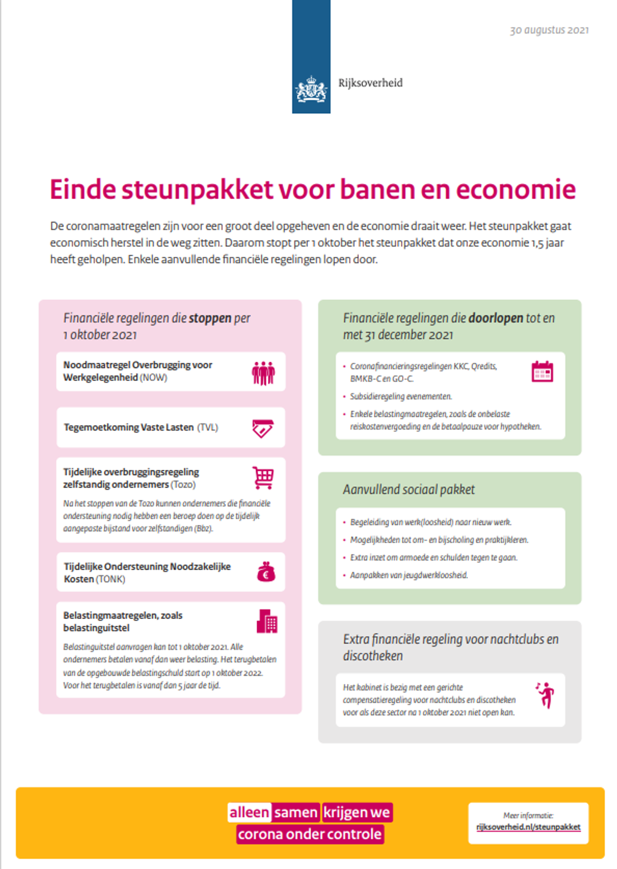 Vanwege positieve macro-economische cijfers heeft het demissionaire kabinet besloten om de generieke coronasteunmaatregelen op 1 oktober definitief stop te zetten. Het gaat om de NOW, TVL (de aanvraag voor Q3 is geopend), Tozo, TONK en een aantal fiscale maatregelen zoals uitstel van belastingbetaling. De corona-financieringsregelingen KKC, Qredits overbruggingskrediet, BMKB-C en GO-C blijven het resterende jaar nog van kracht.