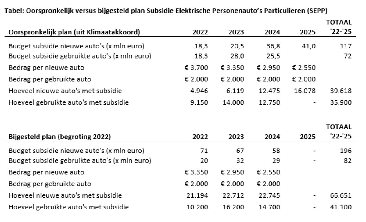 Het kabinet trekt in totaal 90 miljoen euro extra uit voor particulieren die een elektrische auto willen aanschaffen, zo werd daags na Prinsjesdag bekend. Dit wordt gecombineerd met het naar vóren halen in de tijd van subsidiegeld. Daardoor verviervoudigt het budget voor 2022, hoewel het subsidiebedrag per auto wordt verlaagd de eerder voorgenomen 3.700 euro naar 3.350 euro.