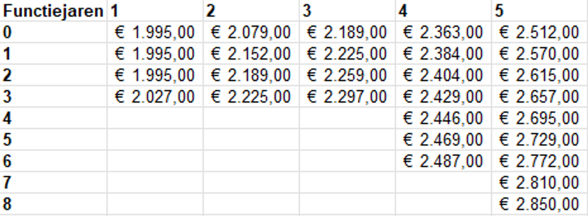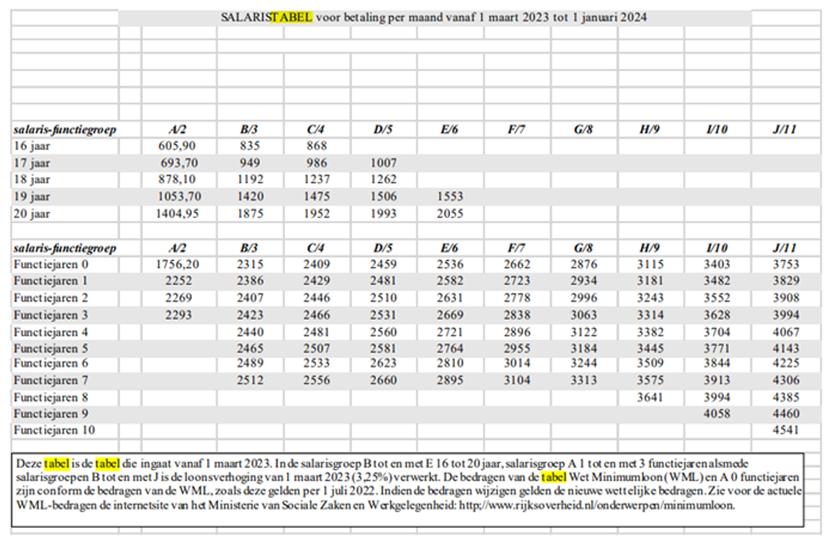 Bij de functiejarentabel zorgt de stijging van het WML ervoor dat in schaal 1 een aantal functiejaren onder het WML terecht komen. Dat mag niet en dus zijn deze bedragen aangepast naar het WML. Per 1 maart was bovendien de loonsverhoging geldig. Vanaf 1 juli gelden dus de volgende bedragen:
