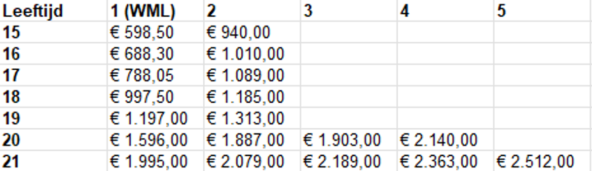 Per 1 januari is het wettelijk minimumloon (WML) fors verhoogd. De jeugdtabel ziet er als volgt uit: