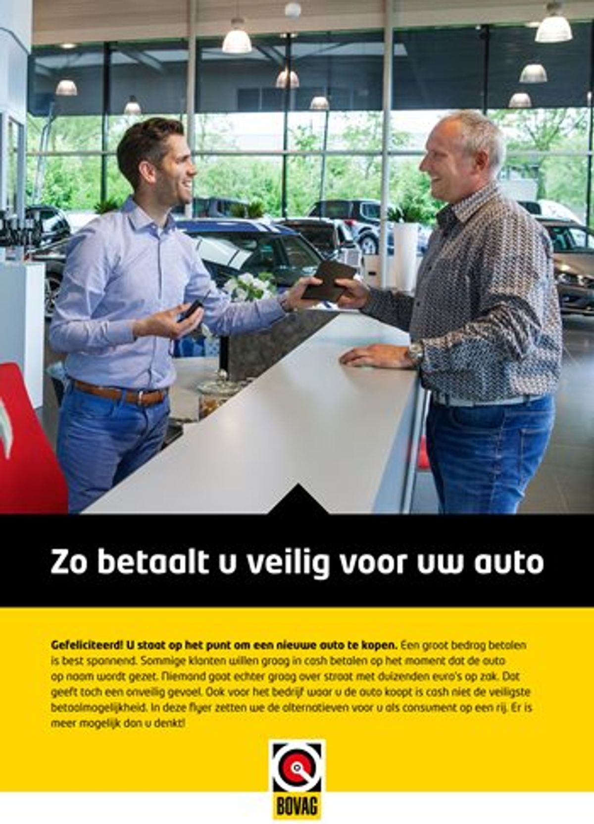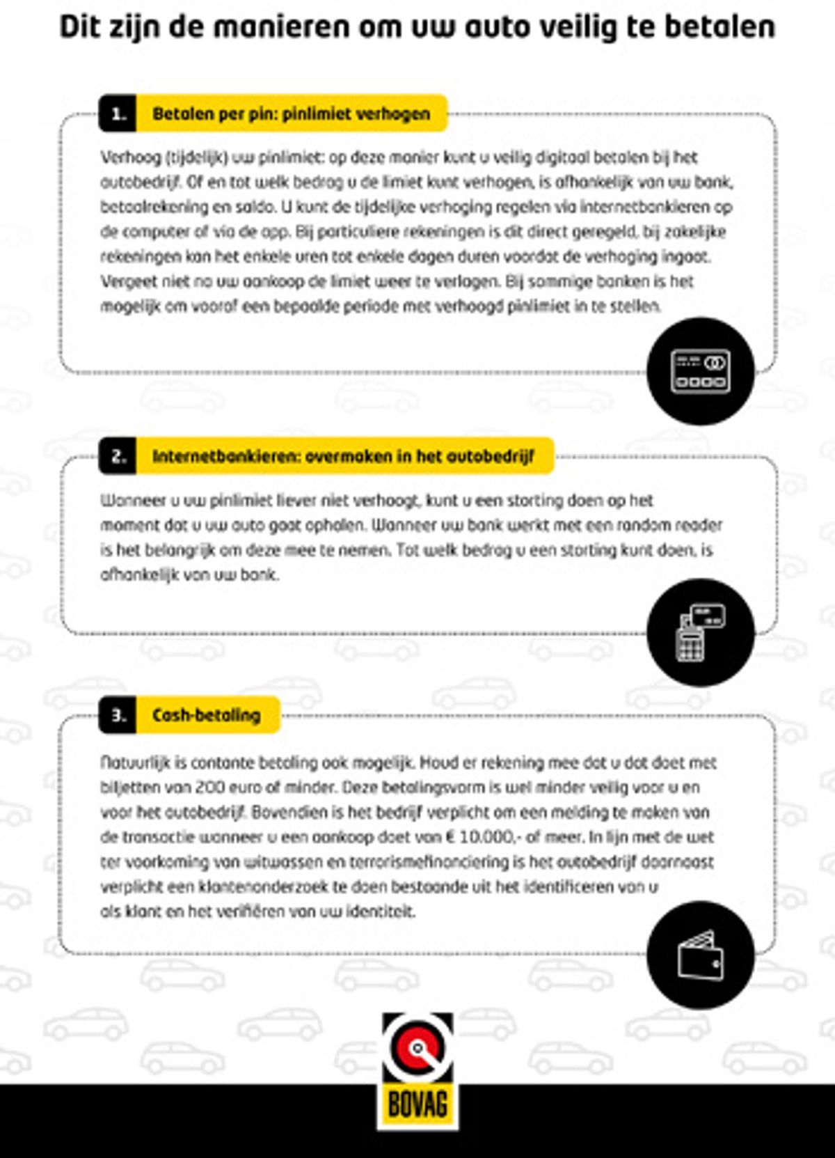 Een groot bedrag betalen voor een auto is best spannend voor uw klant. Sommige mensen willen graag in cash betalen op het moment dat de auto op naam wordt gezet. Niemand gaat echter graag over straat met duizenden auto’s op zak. Dat hoeft ook niet, want er zijn veilige alternatieven voor cashbetalingen. BOVAG heeft deze op een rij gezet in een handige flyer, die u uw klant kunt geven voorafgaand aan de aanschaf van de auto.