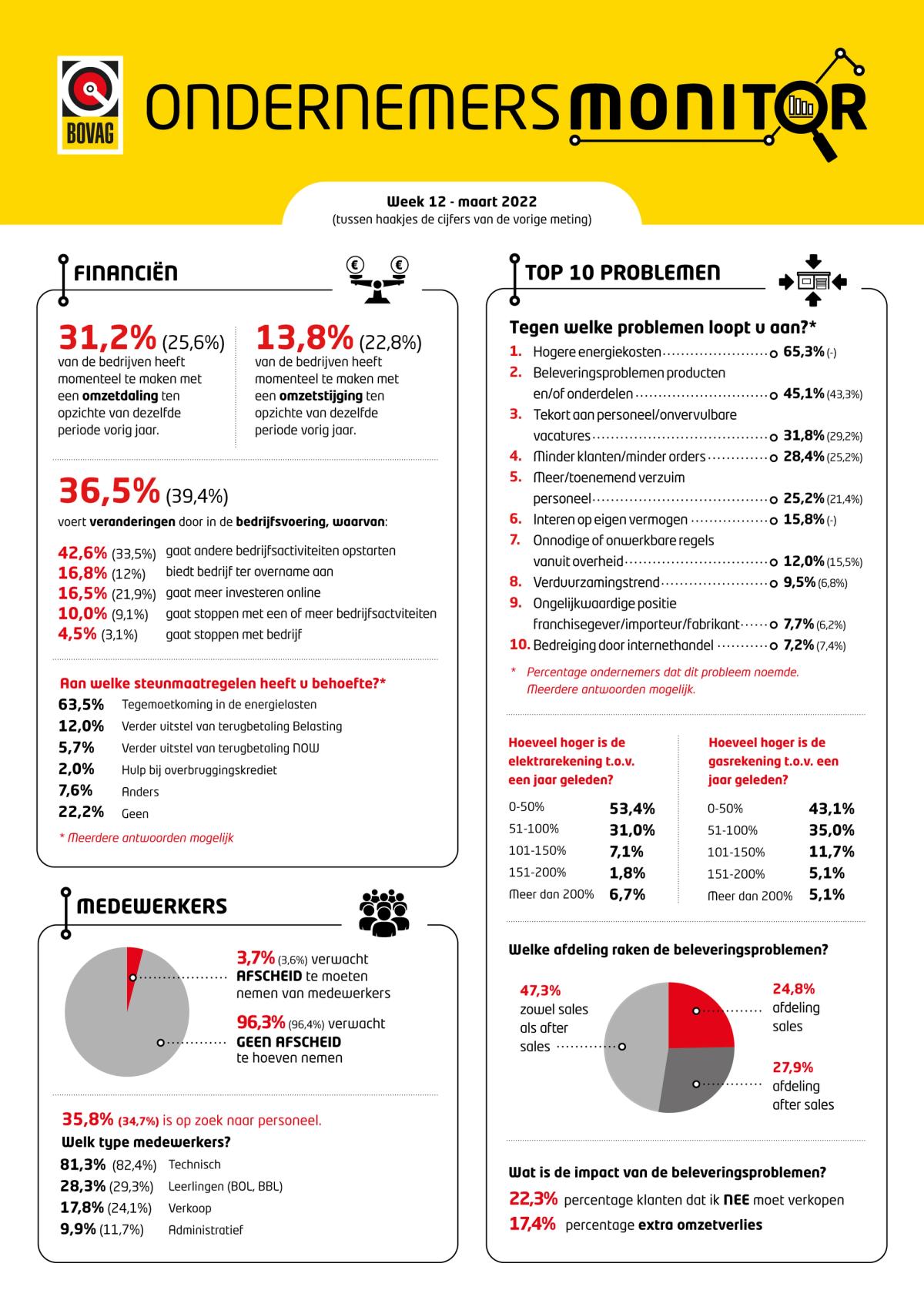 Naast ‘Hogere energielasten’ zijn andere veelgenoemde problemen: ‘Beleveringsproblemen’ (genoemd door 45,1%) , ‘Tekort aan personeel’ (31,8%) , ‘Minder klanten’ (28,4%) en ‘Toenemend verzuim’(25,2%). Dat verzuim blijft toenemen: bij de vorige monitor benoemde 21,4% van de BOVAG-leden dit probleem. Bijna 16% zegt momenteel in te teren op het eigen vermogen.