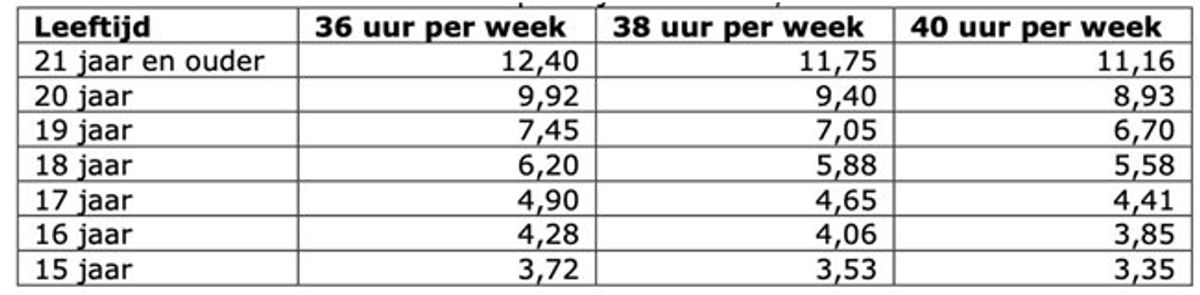 De uurlonen in de tabel zijn naar boven afgerond. Omrekenen leidt tot een iets hoger bedrag per dag, week of maand dan het wettelijk minimumloon. In de tabel per maand, week en dag vindt u de officiële bedragen.