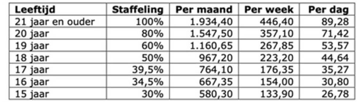 Jongeren onder de 21 jaar hebben recht op een percentage van het wettelijk minimumloon (het wettelijk minimumjeugdloon). De bedragen van het wettelijk minimumloon voor jongeren veranderen dus ook per 1 januari 2023. In de onderstaande tabel staan de bedragen die gelden met ingang van 1 januari 2023.