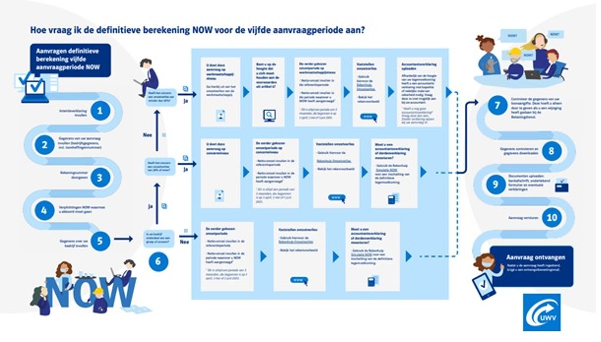 Heeft u NOW aangevraagd voor de maanden april, mei en juni 2021 (NOW 5)? Dan kunt u nu tot en met februari 2023 de definitieve berekening aanvragen. Dat kan door het invullen van het aanvraagformulier op de website van het UWV. U heeft hier wel e-herkenning voor nodig. Klik op onderstaande link voor meer informatie en om direct naar de aanvraag te gaan.
