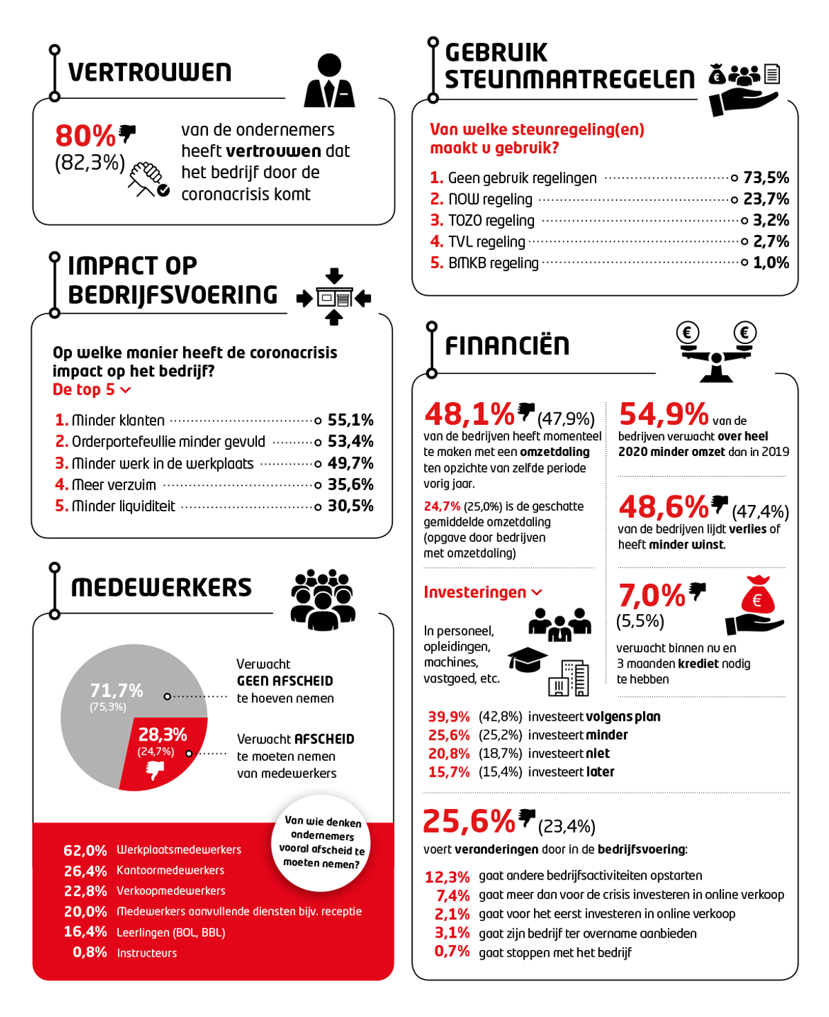 Na een daling in de vorige editie, stijgt het percentage ondernemers met omzetverlies weer (48,1%). Het percentage ondernemers dat verlies lijdt, of minder winst maakt stijgt ook, naar 48,6%. Een nieuwe vraag betreft de omzetverwachting voor heel 2020: een ruime meerderheid (54,9%) verwacht dat zijn omzet lager zal liggen dan over heel 2019.