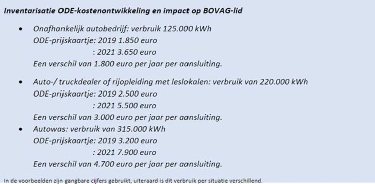 De stijging van de energierekening voor het mkb betreft de zogenaamde ODE (Opslag duurzame energie- en klimaattransitie). ODE is een heffing op het verbruik van aardgas en elektriciteit die ingezet wordt om duurzame energieproductie en de terugdringing van CO2 te financieren via de subsidieregeling SDE++. De stijging van het ODE-tarief zit vooral in schijf 3 van elektriciteit (ruim 300 procent!). Een snelle inventarisatie maakte duidelijk dat het merendeel van de BOVAG-leden zich juist in deze schijf bevindt, terwijl schijf 4 (grootverbruikers) ongemoeid is gelaten. Op Prinsjesdag 2019 werd bekend gemaakt dat de verdeling van de ODE niet meer vijftig/vijftig procent huishoudens bedrijfsleven zal zijn maar eenderde huishoudens en tweederde bedrijfsleven. Dat die tweederde dan voor het overgrote deel neerslaat in schijf 3 en dus het mkb is niet meer houdbaar gegeven de maatschappelijke discussies en de enorme inspanning op het vlak van klimaat- en energietransitie die het mkb te wachten staat. Dat geld kan beter aangewend worden voor een meer duurzame en toekomstbestendige bedrijfsvoering. Nu verdwijnt het in de SDE++-subsidiepot waar het mkb nota bene geen gebruik van kan maken.