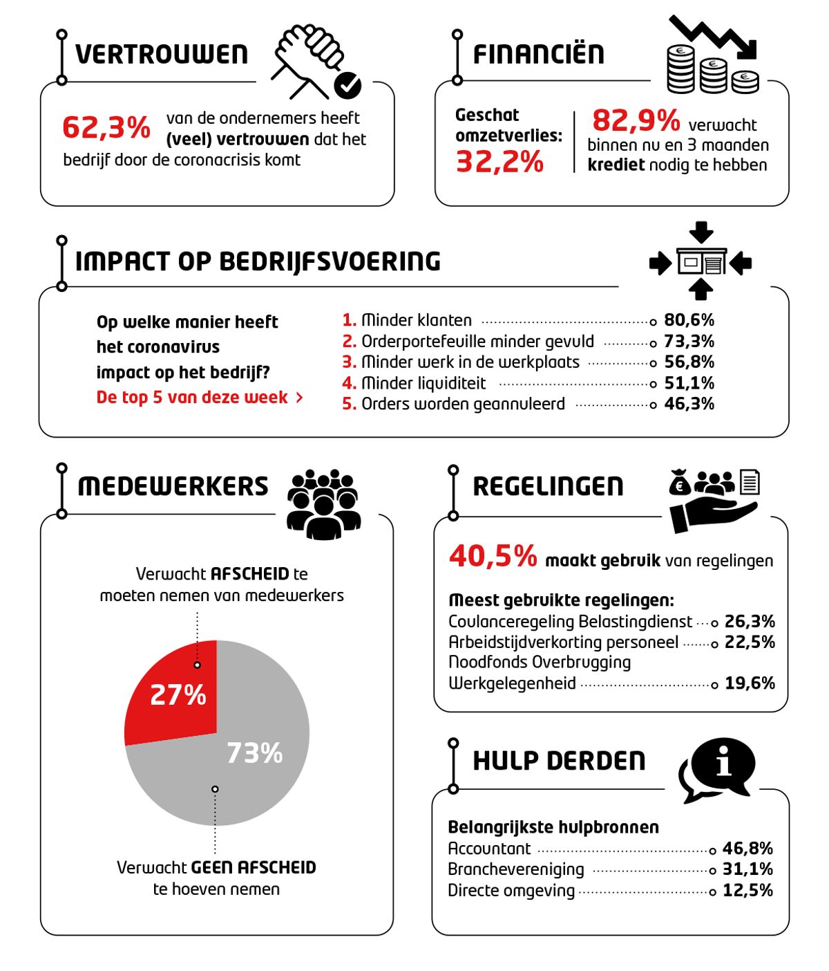 In bovenstaand overzicht is onder andere omzetverlies te zien, maar ook dat twee derde van de ondernemers die het onderzoek invulden, vertrouwen heeft dat hun bedrijf door deze crisis heen komt. Ongeveer een derde van de ondernemers verwacht op termijn afscheid te moeten nemen van medewerkers. De top 5 van meest genoemde problemen waren vorige week: