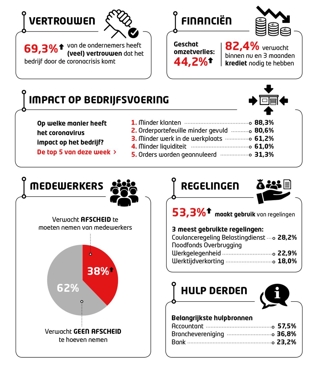 De uitbraak van het Coronavirus heeft impact op álle leden van BOVAG. 88% telt minder klanten in de bedrijven, de orderportefeuille wordt steeds leger (bij 80,6%) en bestaande orders worden geannuleerd (31,3%). Hoewel de werkplaatsen nog wel werk hebben, raken ook die leger bij 61,2% van de bedrijven. Liquiditeit is een toenemend probleem bij twee derde van de BOVAG-leden. Uit deze tweede Coronamonitor blijkt dat het geschatte omzetverlies is toegenomen met 12%: BOVAG-leden hebben – als gevolg van het Coronavirus – te maken met een omzetverlies van 44,2%. Om dit verlies financieel te dragen, verwacht 82,4% van de BOVAG-bedrijven tussen nu en 3 maanden extra krediet nodig te hebben. De verwachte hoeveelheid benodigde ontslagen ten gevolgen van deze crisis is toegenomen (+11%) en de bedrijven zoeken op allerlei manieren steun. Bij BOVAG en andere brancheorganisaties in de mobiliteit, bij hun accountant én maar liefst een derde klopte afgelopen week aan bij zijn bank (nieuwe top 3). Ook de landelijke steunmaatregelingen worden in toenemende mate gebruikt (+12,8%). Ondanks alles zijn de meeste BOVAG-ondernemers nog positief over de afloop, het vertrouwen dat men heeft in het feit dat hun bedrijf door deze crisis heen komt is met 69,3% nagenoeg gelijk aan de eerste peiling.