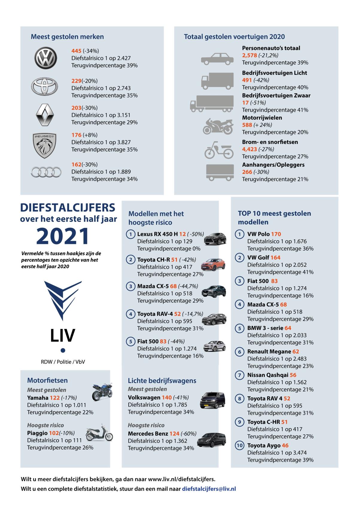 De in 2020 ingezette daling van voertuigdiefstal zet stevig door. In het eerste halfjaar van 2021 zijn er 2578 personenauto’s gestolen, dit is een daling van ruim 21 procent ten opzichte van 2020. De diefstal van lichte bedrijfswagens is zelfs verminderd met ruim 41 procent. De kans op terugvinden van een gestolen voertuig is de eerste dag na de diefstal het grootst en is licht gestegen met ruim 2 procent. Dit blijkt uit cijfers van het Landelijk Informatie- en expertisecentrum Voertuigcriminaliteit (LIV).