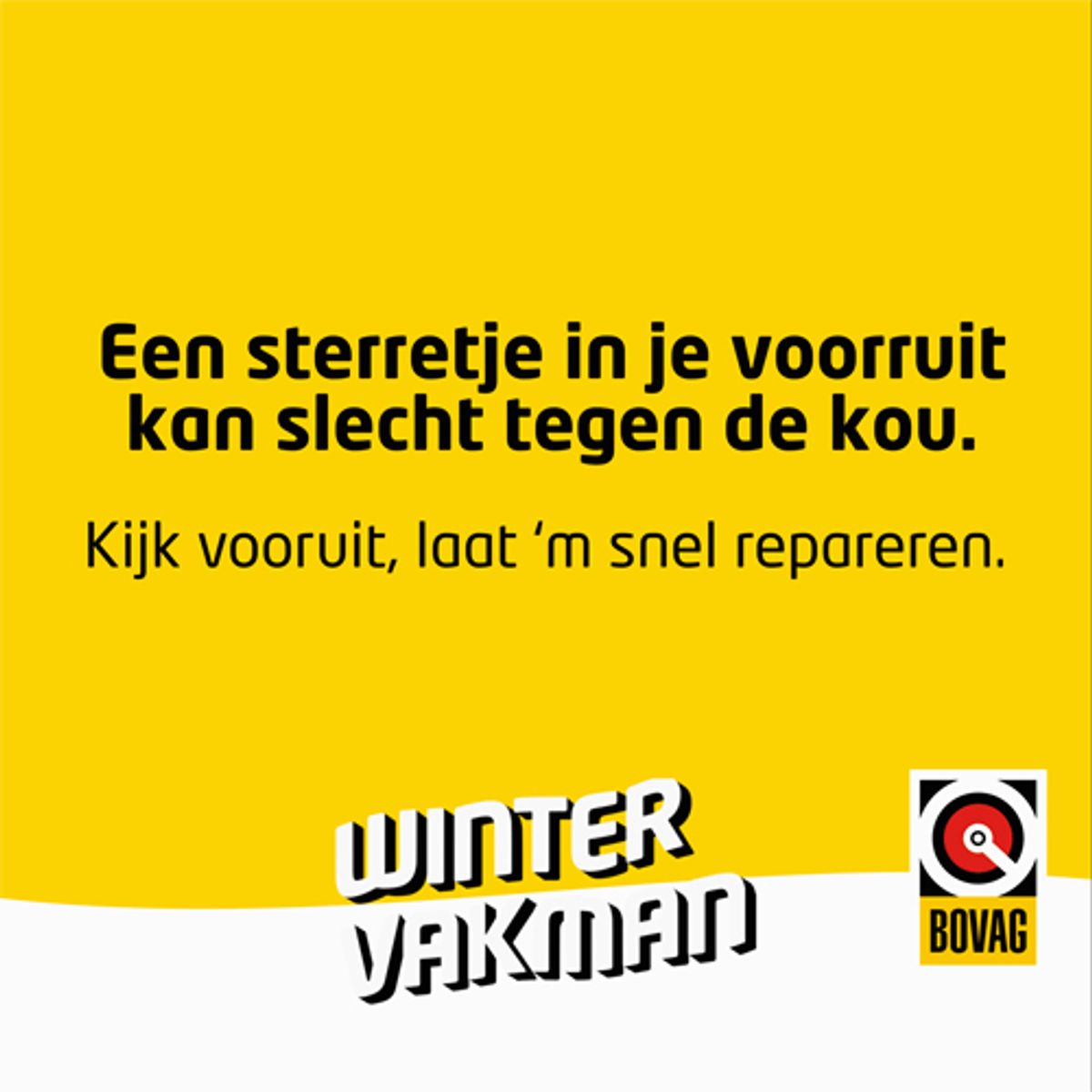 Deze winter bestaat de campagne uit een waaier aan boodschappen. Omdat elke deelbranche andere behoeftes heeft in deze bijzondere tijd. Diverse branches zien wat terughoudendheid als het gaat om reparatie en onderhoud, dus dat nemen we mee in de campagne. Daarnaast kiezen steeds meer mensen – uit vrije wil dan wel noodgedwongen – voor een vorm van individueel vervoer. Dan wil je natuurlijk wel zeker weten dat je ook kan blijven rijden. En dus moet je – zeker voor de winter – zorgen voor goed onderhoud. Daar vragen we in november, december en januari aandacht voor middels banners en opvallende radiospots met een knipoog. Met als centraal thema: de BOVAG Wintervakman. Daar moet je vanzelfsprekend ook zijn voor caravan- en camperonderhoud, waar het winterseizoen bij uitstek geschikt voor is. En los van het thema wintervakman is er in de campagne aandacht voor specifiek de fiets van de zaak, als alternatieve vorm van woon-werkverkeer, en de huurauto.