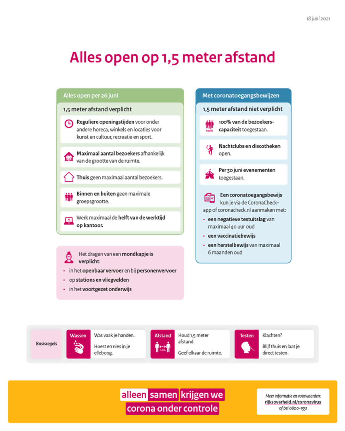 Vanaf 26 juni mag u 1 klant per 5m2 ontvangen in uw winkel of showroom waar dat nu nog per 10m2 geldt. Heeft u een horeca-voorziening? Dan mag deze weer volledig open, wel met inachtneming van de anderhalve meter, gezondheidscheck en placering. Als u een evenement wilt organiseren, dan mogen eendaagse evenementen weer. De vergunning plichtige evenementen mogen weer vanaf 30 juni. Meerdaagse evenementen mogen nog niet. De anderhalve meter-regel mag overigens worden losgelaten bij een evenement als alle klanten of gasten in de corona-app kunnen laten zien dat zij gevaccineerd of getest zijn.