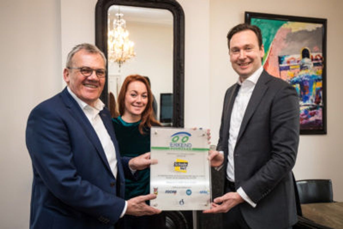 Overhandiging Erkend Duurzaam certificaat aan Nico Rothuijsen en Kim Lammers van Schadenet door Dolf Teuwen van Erkend Duurzaam.