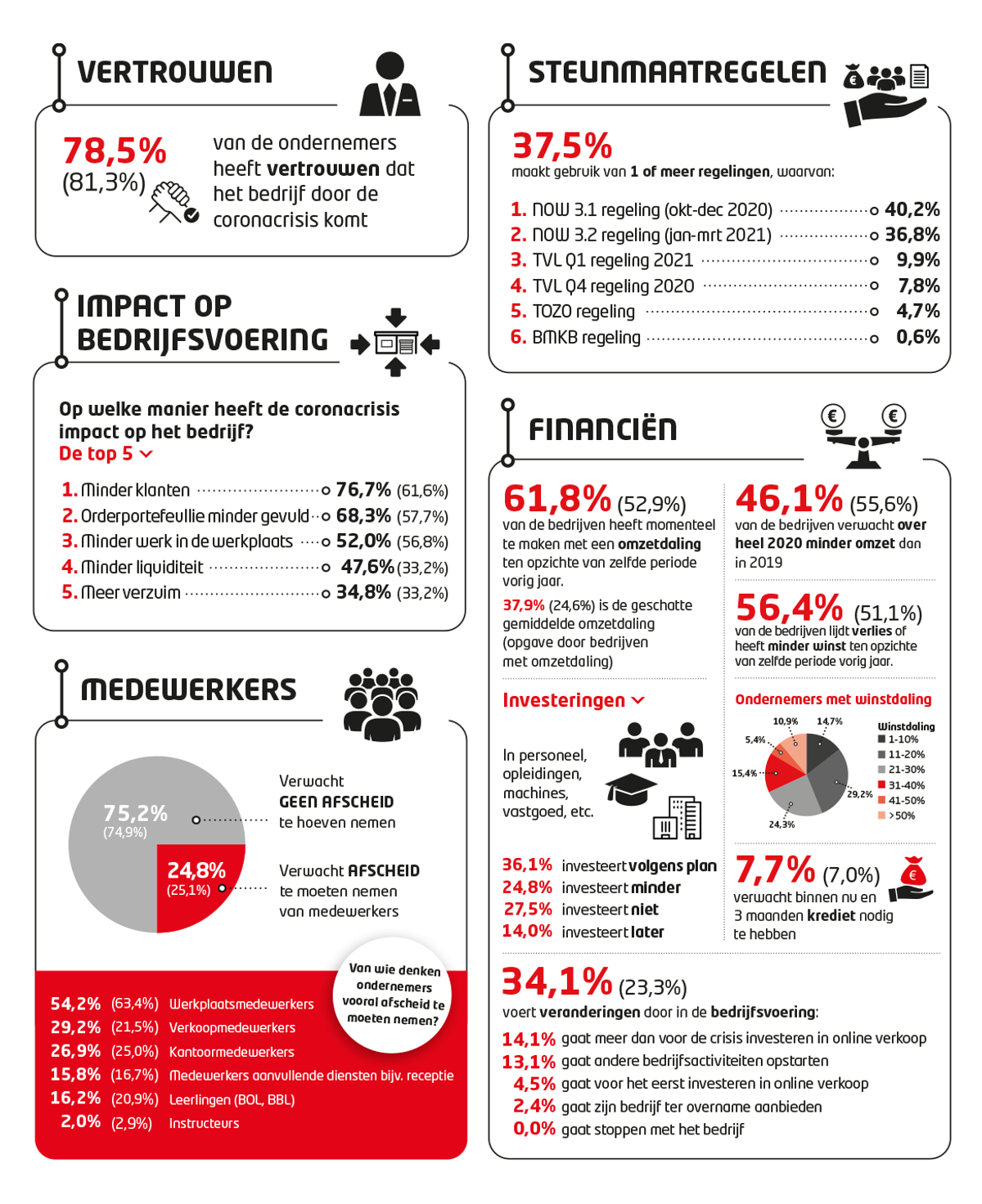 Ruim een derde (33,9%) van de ondernemers is van plan de bedrijfsvoering aan te passen naar aanleiding van de crisis. Dat is 10% meer dan in november 2020. Extra inzetten op online verkoop is daarin de grote stijger (+9,5%). 'Minder klanten' is nog steeds het meest genoemde gevolg van de crisis (76,7%). Het percentage ondernemers dat dit noemde steeg bovendien fors (+15,1%) Op de voet gevolgd door 'minder gevulde orderportefeuille' en 'minder liquiditeit'. Het werk in de werkplaats lijkt, tegen de stroom in, licht aan te trekken.