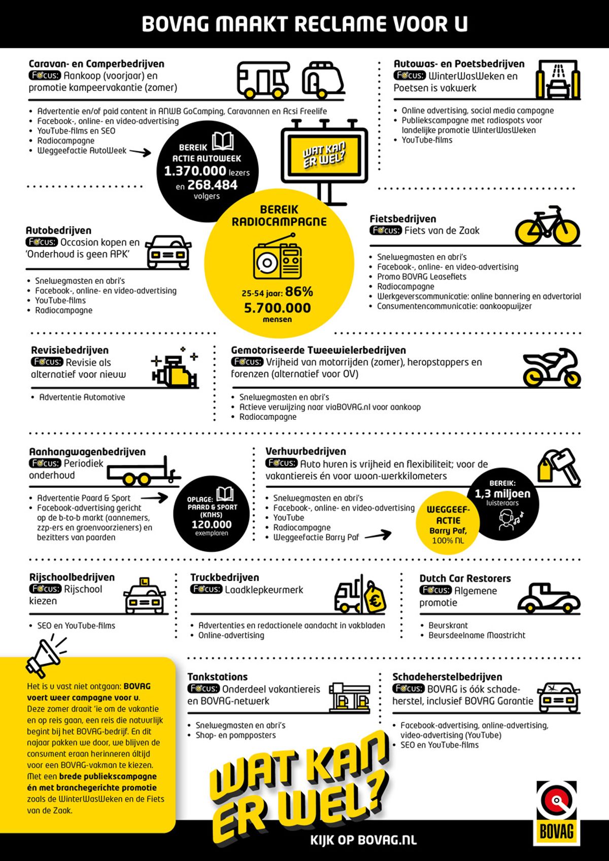 Het is u vast niet ontgaan: BOVAG voert weer campagne voor u. Deze zomer draait ‘ie om wat er wél kan, met nadruk op individueel vervoer. Iets waar BOVAG-leden van oudsher heel goed in zijn. Dat begint dus allemaal bij het BOVAG-bedrijf. En dit najaar pakken we door, we blijven de consument eraan herinneren áltijd voor een BOVAG-vakman te kiezen. Met een brede publiekscampagne én met branchegerichte promotie zoals de WinterWasWeken en Fiets van de Zaak. De infographic op deze pagina geeft een overzicht van de gehele campagne.