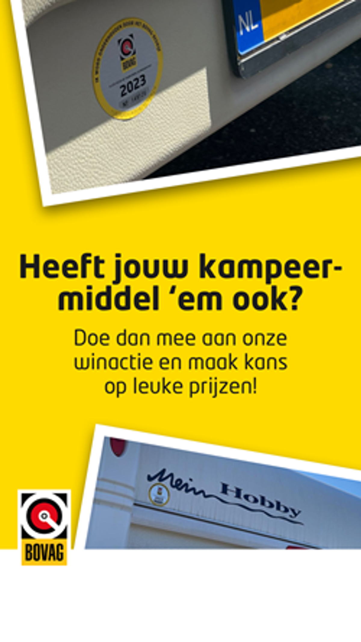 BOVAG houdt in juli en augustus een actie onder kampeerders. Als zij een foto van hun BOVAG Onderhoudsbeurt-sticker delen op Facebook of Instagram, maken zij kans op mooie prijzen. Met deze winactie zetten we de BOVAG Onderhoudsbeurt, de trots van BOVAG Caravan- en Camperbedrijven, in het zonnetje. Inmiddels hebben al vele kampeerders hun BOVAG-sticker gepost op social media. Deel de winactie deze maand nog met uw klanten, zodat ook zij kans maken op een prijs én zodat de naamsbekendheid van de BOVAG Onderhoudsbeurt nog verder groeit.