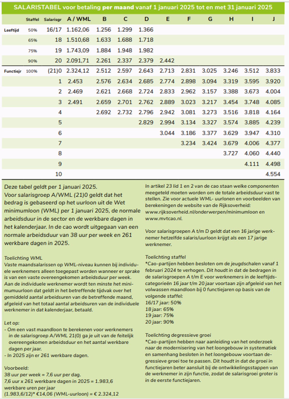 Onderstaand de nieuwe loontabel zoals die geldt per 1 januari 2025. Daarin is de loonsverhoging van 1,5 procent verwerkt. Ook de verhoging van het wettelijk minimumloon per 1 januari 2025 is hierin opgenomen in salarisschaal A.