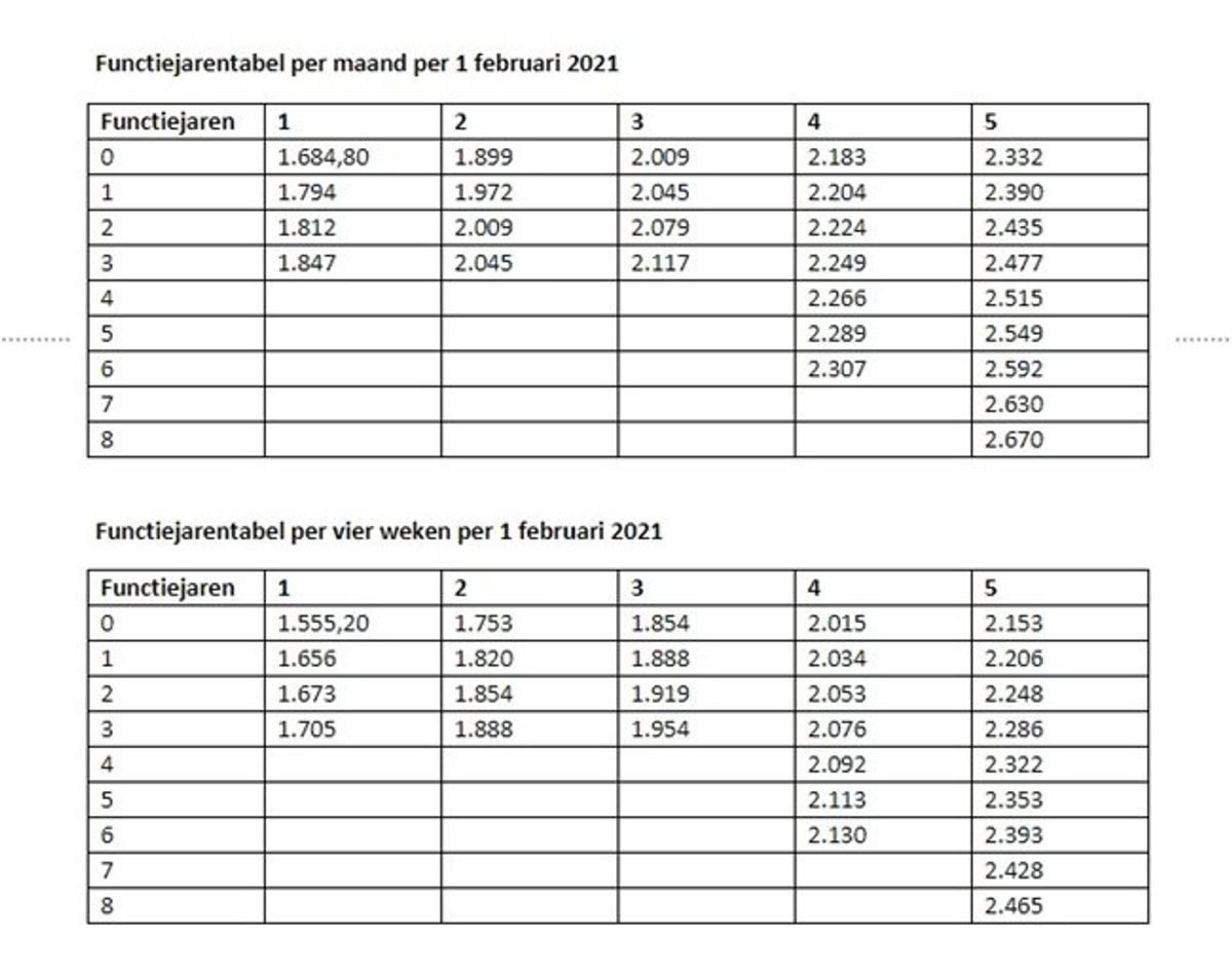 Cao-salarisverhogingen gelden vanaf functiegroep 2. Functiegroep 1 is gelieerd aan de Wet minimumloon en zal dus conform wettelijke bepalingen aangepast worden.