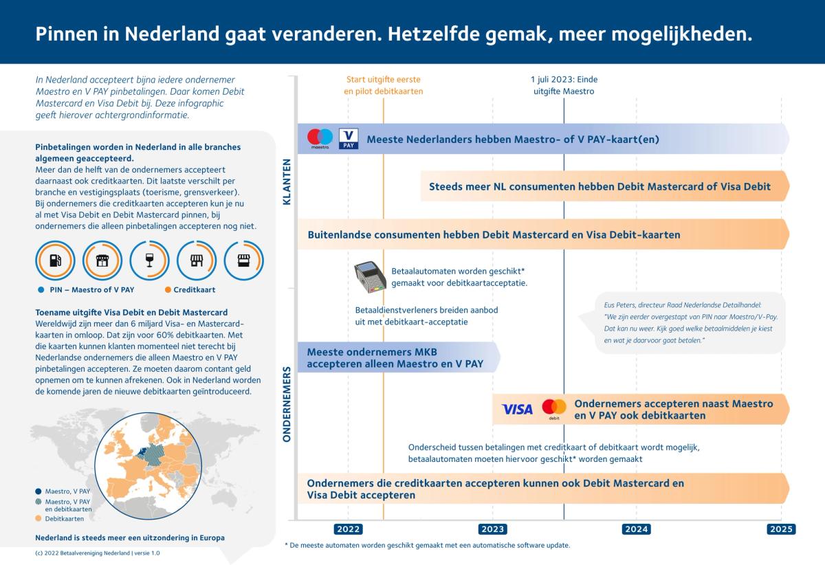 Alle Nederlandse Maestro- en V Pay-pinpassen worden vanaf 2023 vervangen door de Debit Mastercard en Visa Debit. Met deze passen kan makkelijker online of in winkels in het buitenland worden betaald. Voor het eind van 2022 moeten alle betaalautomaten van (toonbank)ondernemers Debit Mastercard en Visa Debit accepteren. Daarnaast moeten klanten ook met Maestro en V Pay kunnen blijven betalen. De meeste betaalautomaten kunnen met een software-update geschikt gemaakt worden. Bij een klein aantal is vervanging nodig.