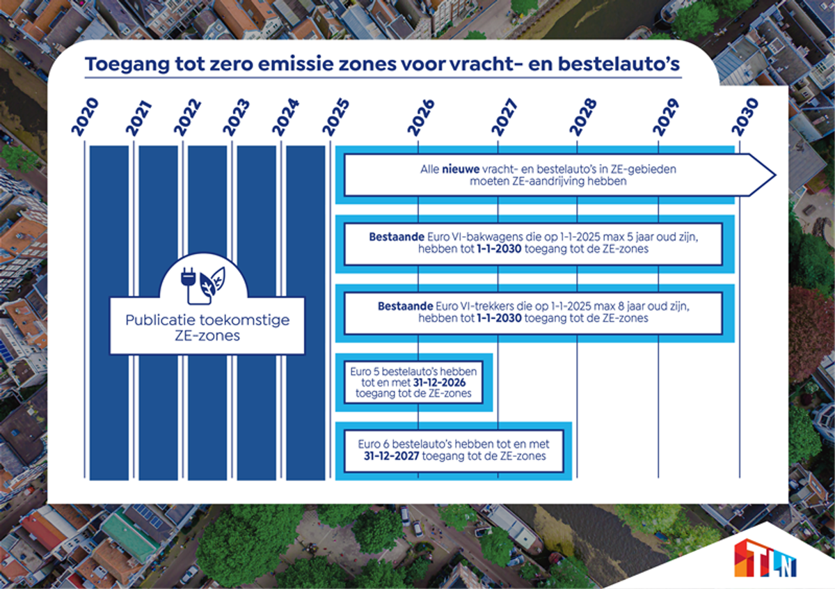 Voorwaarde voor invoering van zo’n zone is dat een gemeente deze minimaal vier jaar van tevoren aankondigt. Nieuwe bestel- of vrachtwagens die na 2025 op kenteken gezet worden, moeten emissieloos zijn om in deze stadscentra te komen. Voor bestaande voertuigen op fossiele brandstof geldt uitstel, mede in het kader van de coronacrisis: voor lichte bedrijfswagens eindigt de overgangsperiode in 2027 en voor vrachtauto’s is dat eind 2029. Particulieren met een bestelbus of vrachtauto kunnen een ontheffing aanvragen en dat geldt ook voor bepaalde categorieën voertuigen waarvoor nog geen goed emissieloos alternatief beschikbaar is. Tussen 2021 en 2025 komt er naast allerlei fiscaal aantrekkelijke investeringsregelingen subsidie beschikbaar voor de aanschaf van een emissieloze bestelbus of vrachtwagen.