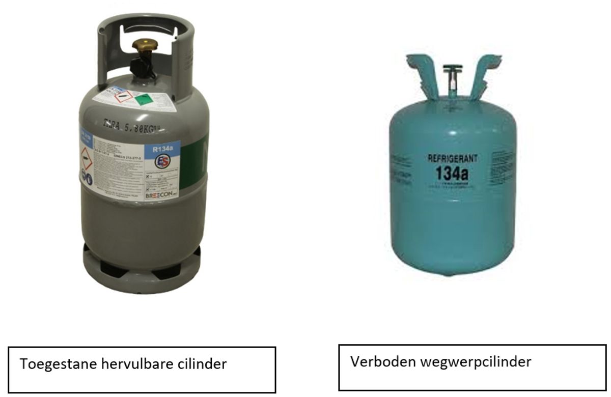 Op de onderstaande foto’s ziet u een toegestane en verboden cilinder voor koudemiddelen: