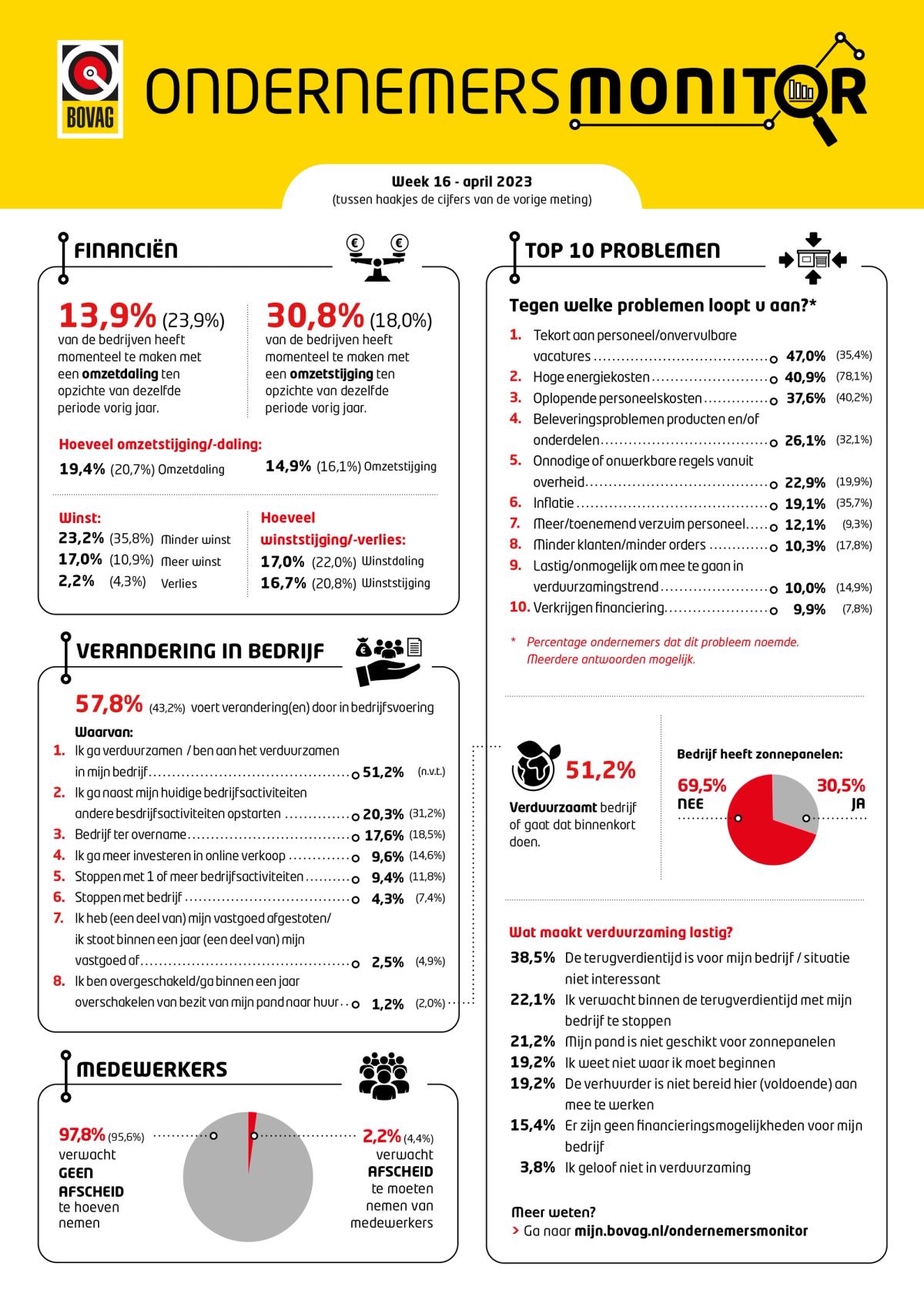 Op de vraag met welke problemen ondernemers op dit moment het meest worstelen, heeft 'tekort aan personeel', de eerste plek overgenomen van 'hoge energiekosten'. 'Oplopende personeelskosten' staat net als in de vorige editie op plek 3 van meest genoemde problemen voor ondernemers.