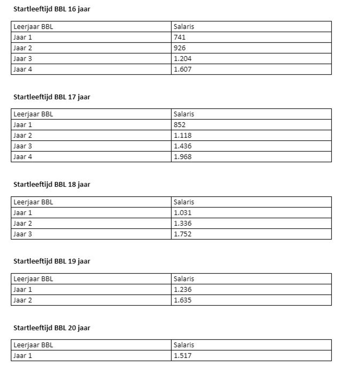 Er is een salaristabel voor een 16-, 17-, 18-, 19- en 20-jarige BBL’er. De leeftijd van de medewerker bij aanvang van de BBL-opleiding is bepalend voor de tabel die u toepast. Is de medewerker dus 16 jaar wanneer hij start met zijn BBL-opleiding, dan past u op deze medewerker de BBL tabel 16 toe gedurende zijn gehele opleiding zolang hij nog geen 21 jaar is. Is de medewerker 20 jaar bij aanvang van de BBL-opleiding, dan geldt voor hem de BBL tabel 20. Vanaf het moment dat de medewerker 21 jaar wordt stroomt hij door naar de reguliere salaristabellen en wordt zijn functie ingedeeld aan de hand van het Handboek Functie-indeling Metaal & Techniek. Hij heeft dan minimaal recht op het wettelijk minimumloon en bouwt functiejaren op.