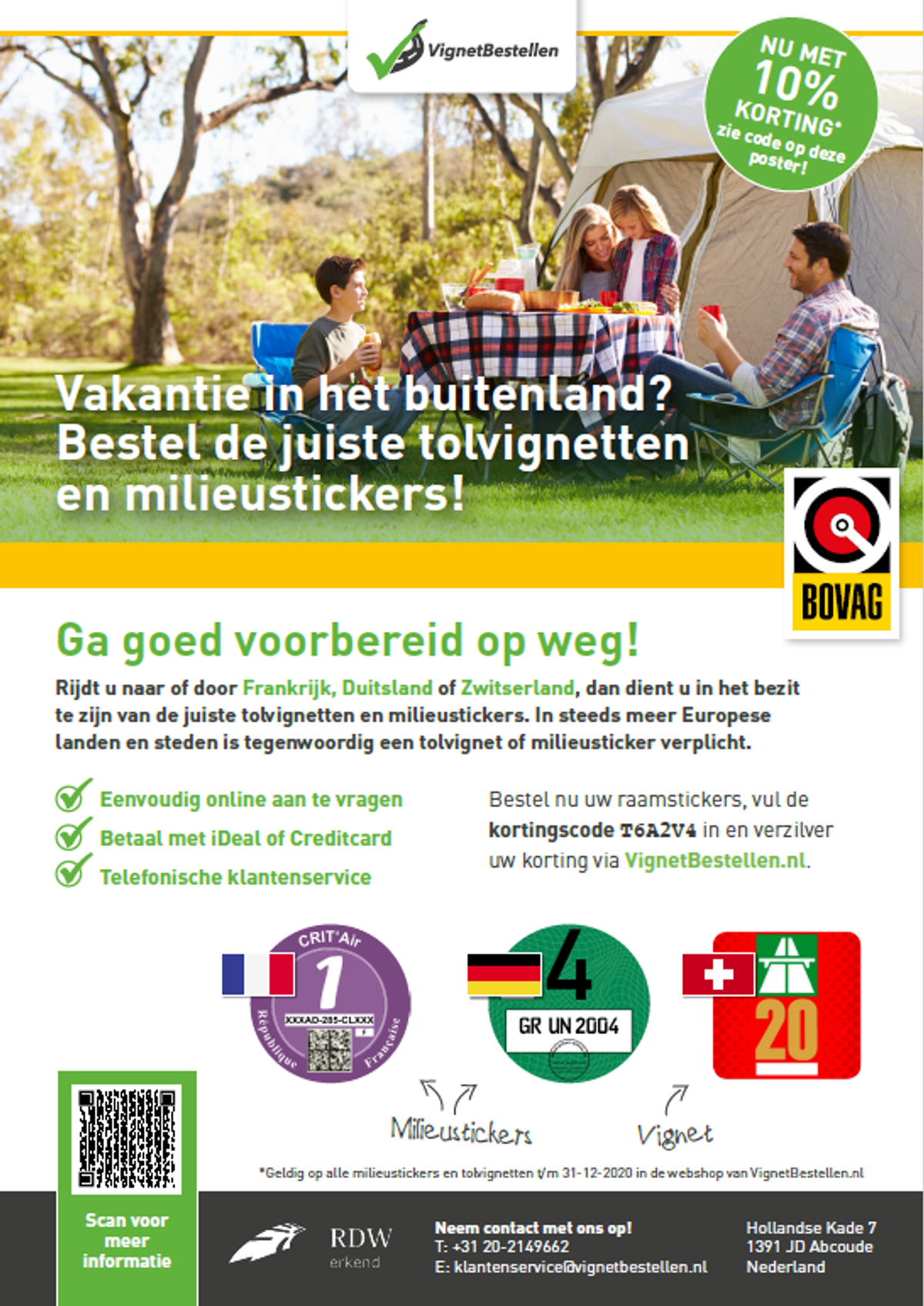 De coronamaatregelen in binnen- én buitenland gooien flink wat roet in het eten van veel vakantiegangers. Hoewel de laatste persconferentie hoopgevend is wat het vakantieseizoen betreft, zijn veel consumenten voorzichtig met het (opnieuw) vastleggen van (aangepaste) vakantieplannen. Vermoedelijk beslissen velen pas op het laatste moment, aan de hand van de actualiteit, waar de reis naartoe gaat. De termijn om dan nog eventueel benodigde vignetten of milieustickers aan te schaffen wordt daarmee (te) kort. Dus bedachten we deze actie in samenwerking met de BOVAG Ledenwinkel. Hiermee kan uw klant op korte termijn alsnog de benodigde vignetten bestellen en ook nog eens met tien procent korting. Dat is een mooi cadeau voor uw klant, toch?