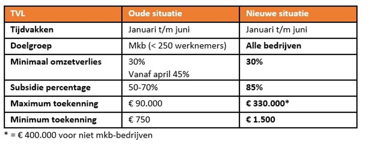 De Tegemoetkoming Vaste Lasten (TVL) wordt uitgebreid zodat meer ondernemingen hierop aanspraak kunnen maken. De maximale vergoeding gaat naar 85 procent van de vaste lasten. Doordat de eis van maximaal 250 medewerkers wordt losgelaten, kunnen deze keer ook grotere bedrijven aanspraak maken op de regeling. Het maximale subsidiebedrag gaat omhoog van 90.000 euro naar 330.000 euro voor het MKB en 400.000 euro voor niet-MKB.