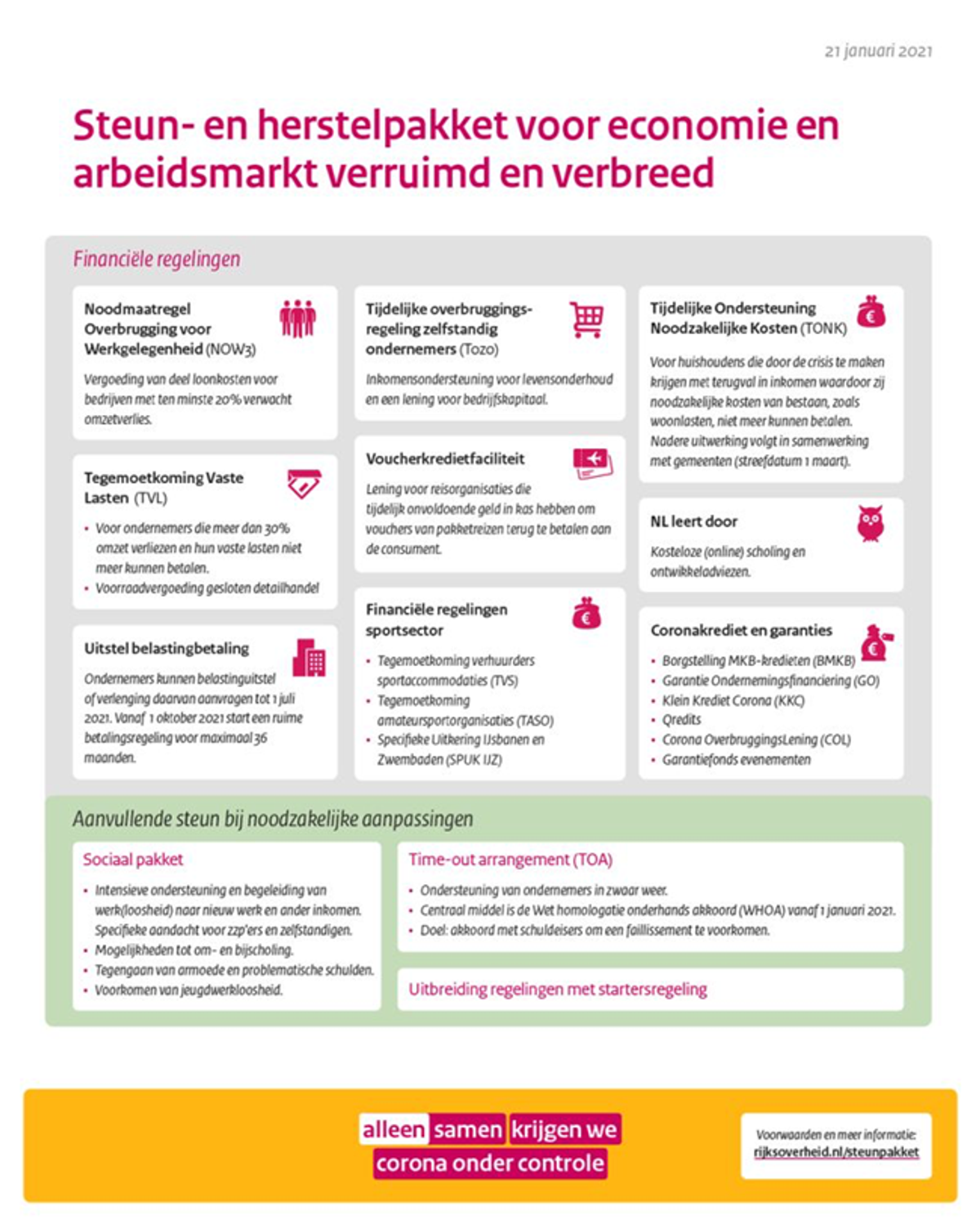 Het steunpakket dat Nederland en zijn ondernemers door de crisis moet helpen, wordt vanwege de tweede lockdown uitgebreid. Het gaat om een totaal van 7,6 miljard euro en de verruimingen gelden voor het eerste halfjaar van 2021. Een groot deel van het BOVAG-puntenlijstje zien we terugkomen in onderstaande opsomming.