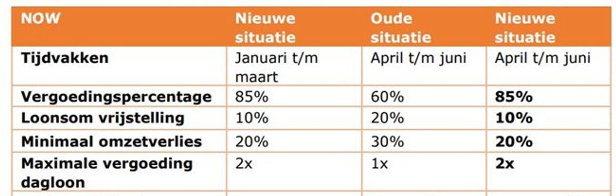 De NOW wordt verhoogd van 80 naar 85 procent van de loonsom. De loonsomvrijstelling blijft 10 procent. NOW kan vanaf 15 februari 2021 worden aangevraagd voor de maanden januari, februari en maart.
