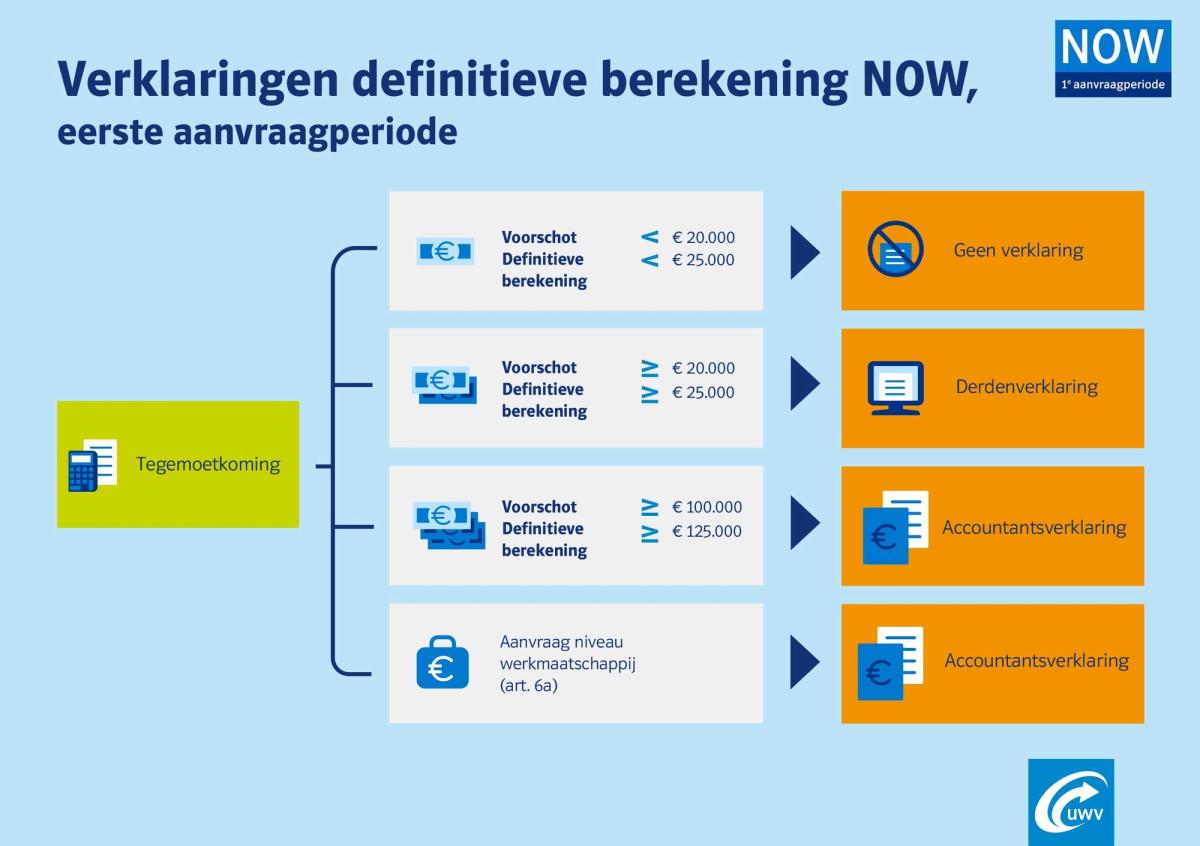 Of u een accountants- of derdenverklaring moet indienen bij de controle voor de NOW 1 is afhankelijk van de hoogte van het subsidiebedrag en de definitieve tegemoetkoming. Het UWV heeft daar een handig stroomschema voor gemaakt: