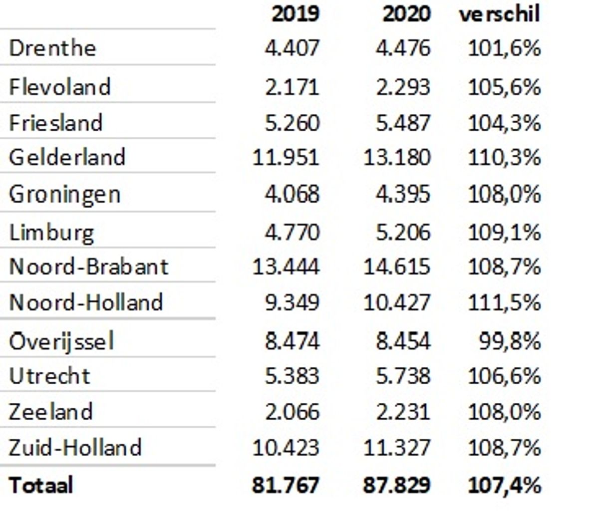 Tot en met november werden er in Nederland 7,4 procent meer caravans en campers aangeschaft door consumenten, zowel via de vakhandel als van andere particulieren, vergeleken met de eerste elf maanden van 2019. Alleen in Overijssel lag dat aantal dit jaar lager, terwijl in Noord-Holland met een plus van 11,5 procent de kooplust juist fors boven het landelijke gemiddelde lag. Ook in Gelderland (plus 10,3 procent), Limburg (plus 9,1 procent), Zuid-Holland, Noord-Brabant (beide plus 8,7 procent), Groningen en Zeeland (beide plus 8,0 procent) is de interesse voor kampeermiddelen dit jaar bovengemiddeld.