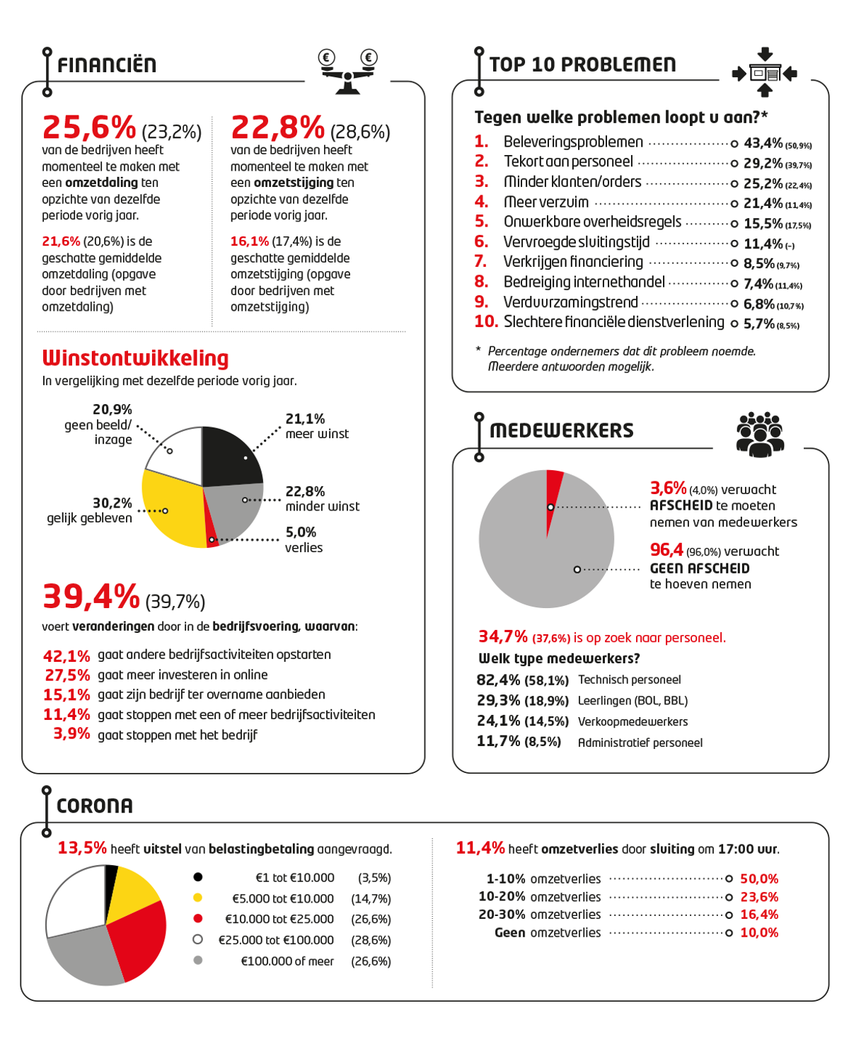 Leveringsproblemen vormen nog altijd het grootste pijnpunt voor ondernemers. Opvallend is dat het percentage ondernemers met stijgend verzuim onder personeel is verdubbeld. Ruim 11 procent heeft last van de avondlockdown. En zo'n 13 procent van de BOVAG-leden heeft uitstel van belastingbetaling aangevraagd.