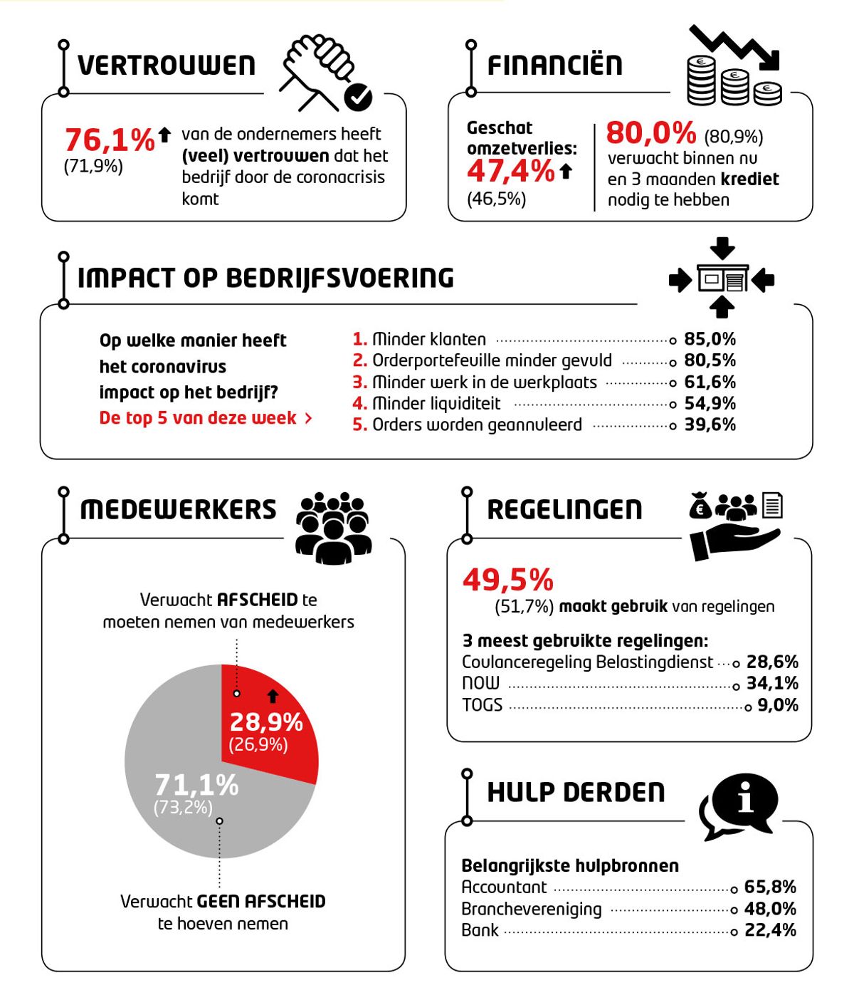BOVAG-leden geven aan dat de situatie min of meer hetzelfde is als vorige week. Wel neemt het vertrouwen in een goede afloop toe. Lees hieronder alle bevindingen. Tussen haakjes staan de cijfers van week 3.