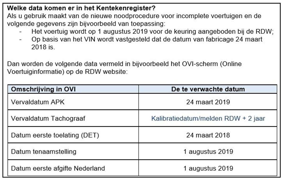 Als u gebruik maakt van de nieuwe noodprocedure voor incomplete voertuigen en de volgende gegevens zijn bijvoorbeeld van toepassing: