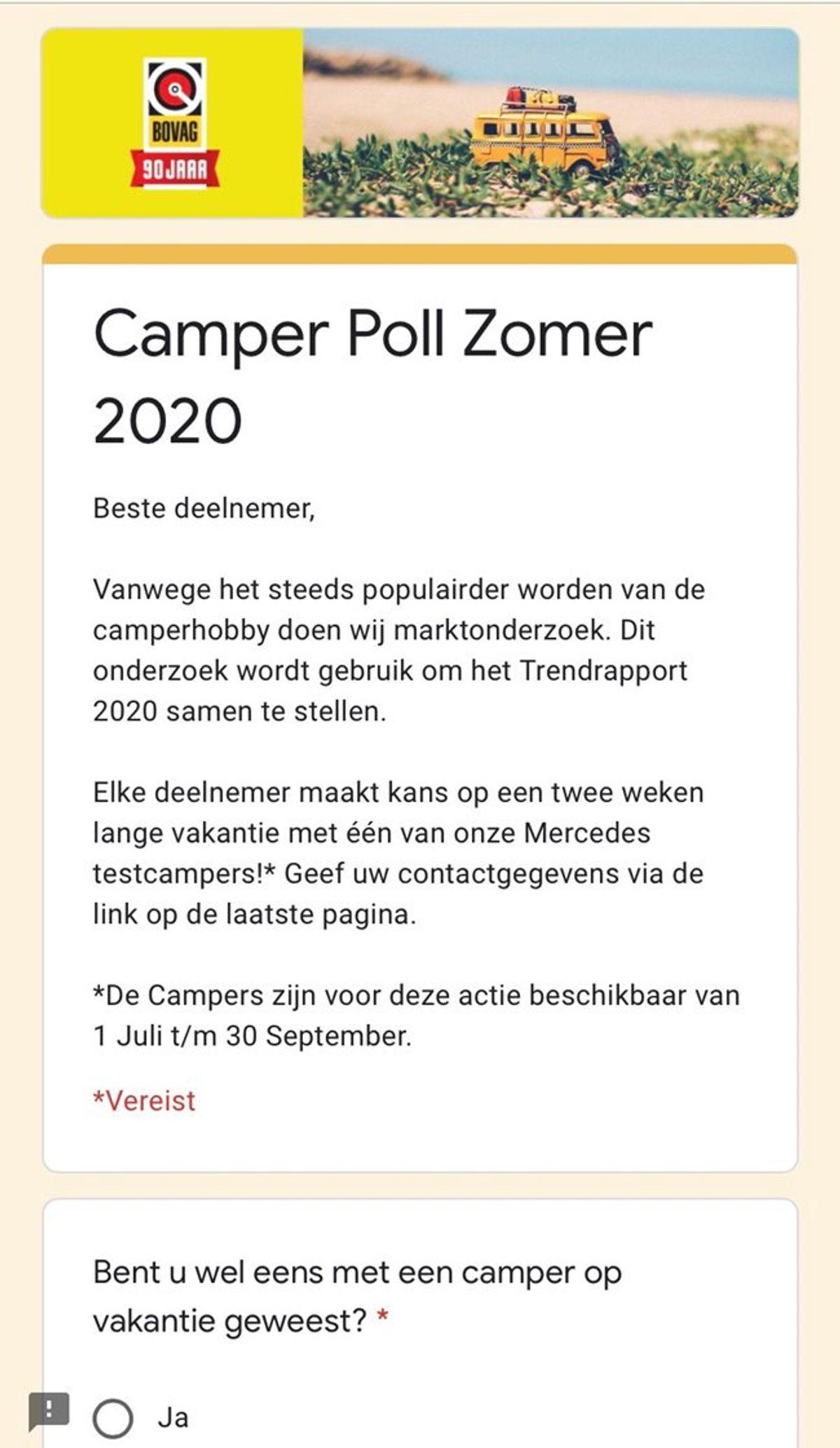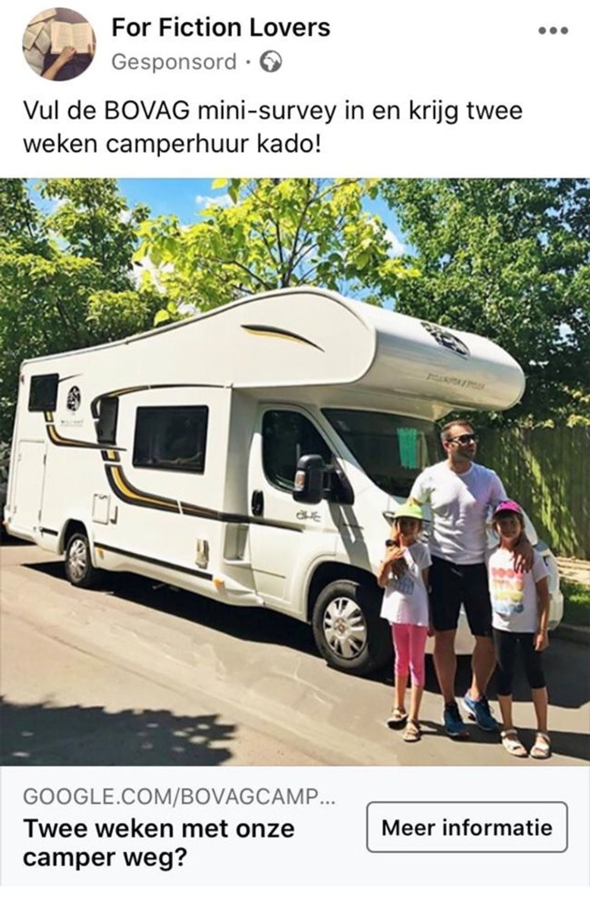 Op Facebook zijn oplichters actief met een vragenlijst over campers waarin de naam van BOVAG en het (jubileum)logo worden misbruikt. Pas op: deze vragenlijst is NIET van BOVAG. Deze methode wordt ook onder naam van andere bedrijven en organisaties gebruikt. Klik niet op de link, hiermee worden persoonlijke gegevens afhandig gemaakt. Deel dit bericht om zoveel mogelijk mensen te waarschuwen.
