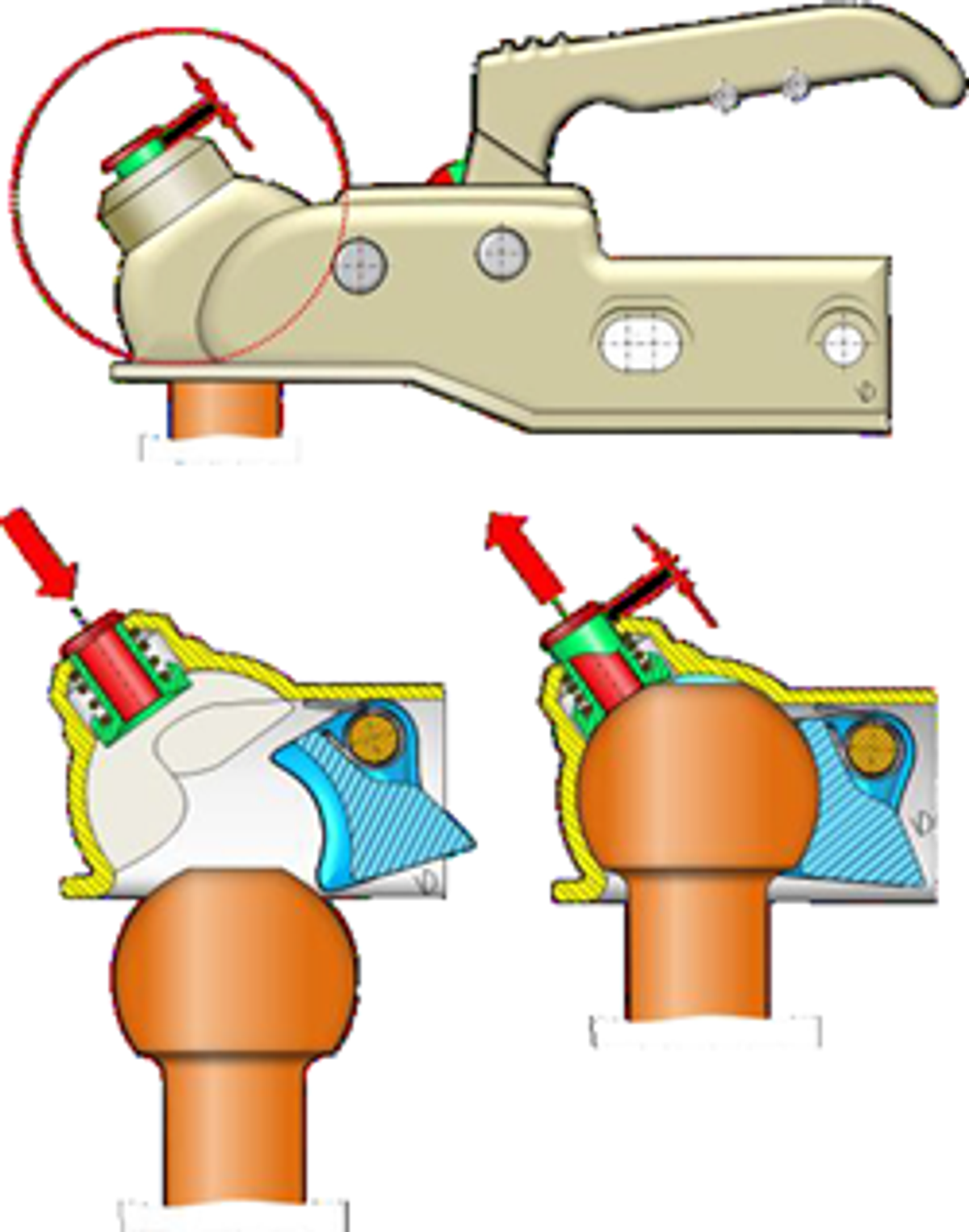 Op het moment dat de trekhaakkogel in de koppeling zit wordt een veer in de veiligheidsindicator met druk belast. Die veer drukt de indicator naar buiten waardoor het groene gedeelte aan de buitenzijde zichtbaar wordt. Wanneer de kogel wordt verwijderd uit de koppeling gaat de veer weer terug de koppeling in en is de indicator rood.