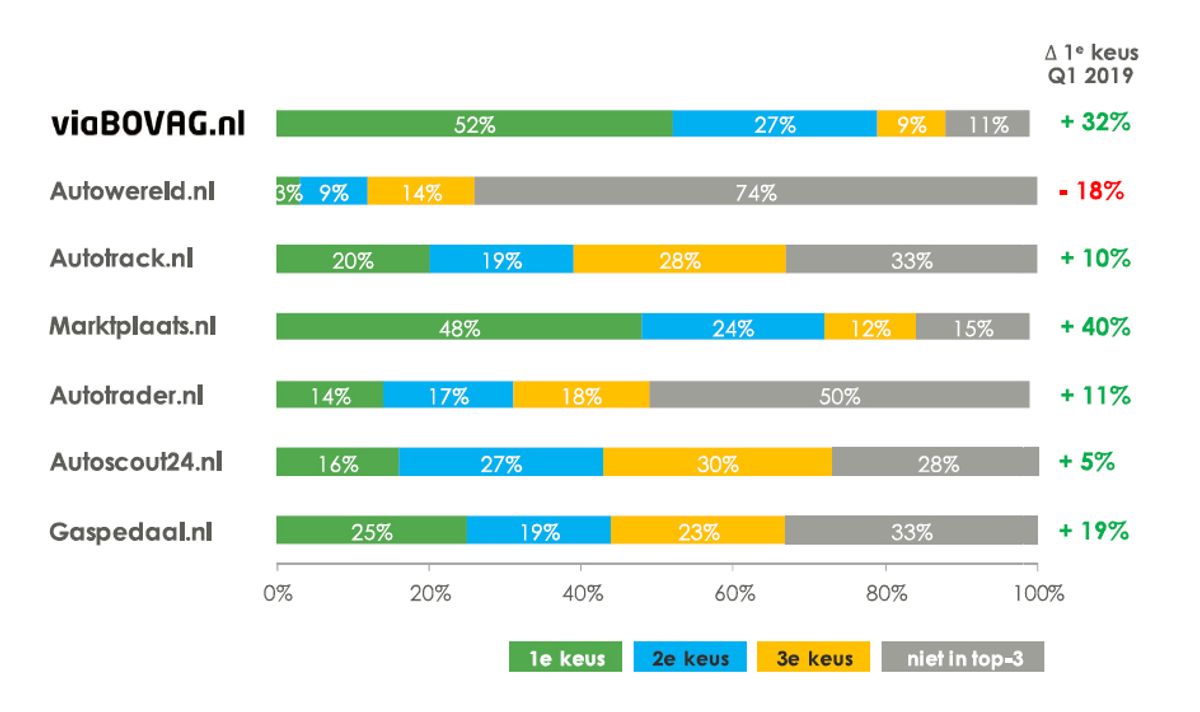 Van de consumenten die viaBOVAG.nl kennen, geeft ruim de helft aan dat viaBOVAG.nl de eerste keus is als zij op zoek gaan naar een auto.