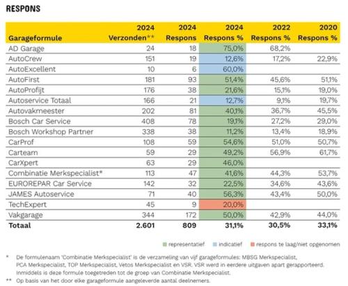 BOVAG past duidelijke criteria toe voor de representativiteit van dit onderzoek. De respons van de formules varieert tussen de 11,2 en 75 procent. De respons bij 13 formules is representatief en wordt volledig opgenomen in de rapportage (groene markering). Bij drie formules leidt de respons tot een indicatieve opname in de rapportage (blauwe markering). Deze zijn wel opgenomen in het rapport, maar krijgen geen algemeen waarderingscijfer. Deelnemers van formule TechExpert (rode markering) zijn wel aangeschreven, maar de respons is te laag om op te nemen in dit rapport.