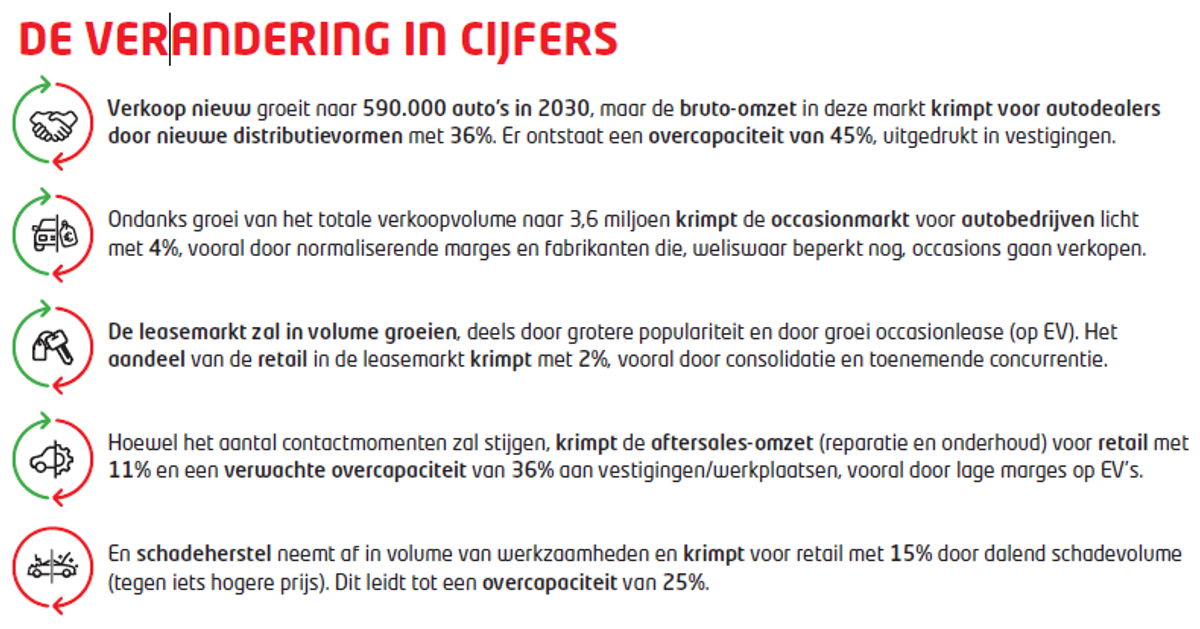 - Verkoop nieuw groeit naar 590.000 auto’s in 2030, maar de bruto omzet in deze markt krimpt voor autodealers door nieuwe distributievormen met 36%. Er ontstaat een overcapaciteit van 45%, uitgedrukt in vestigingen.