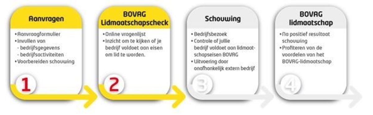 Tijdens het gesprek is aangegeven dat je een aantal stappen moet doorlopen om BOVAG-lid te kunnen worden. Deze stappen vind je hieronder overzichtelijk op een rijtje.